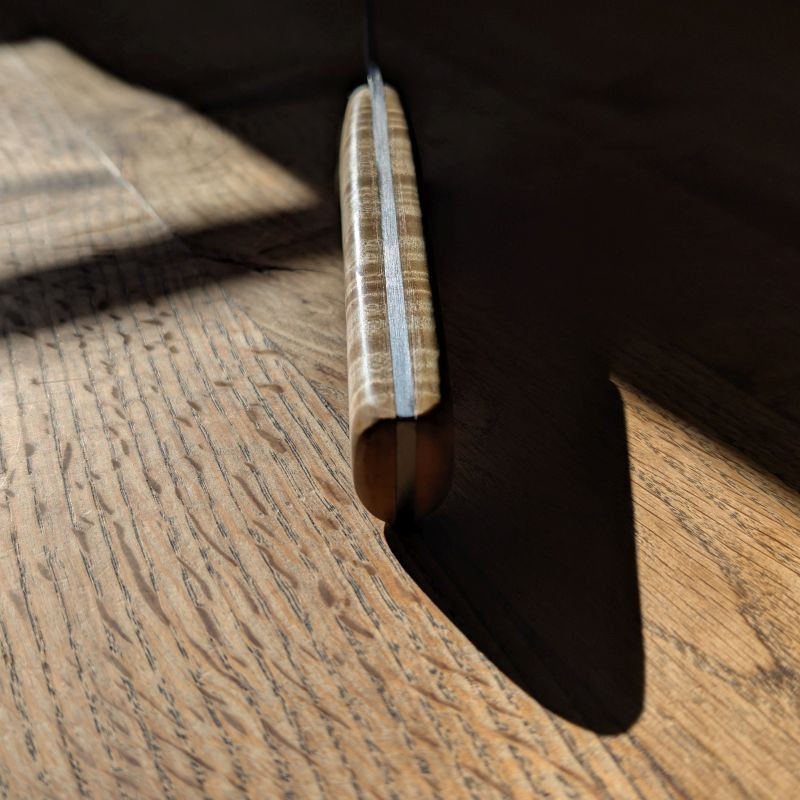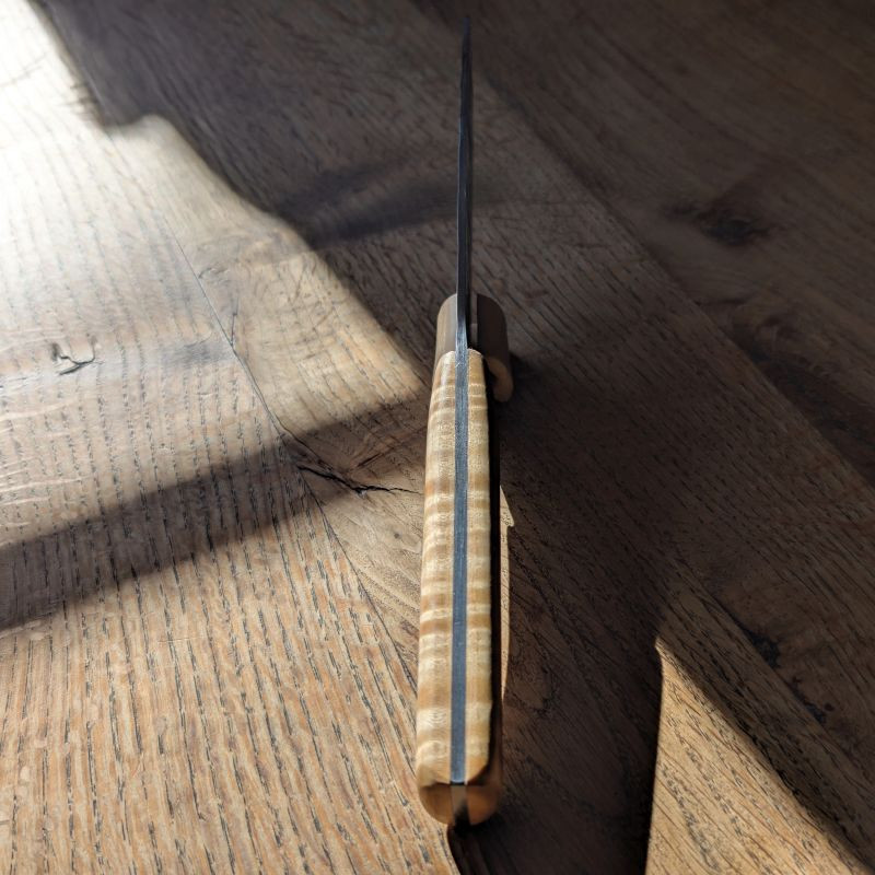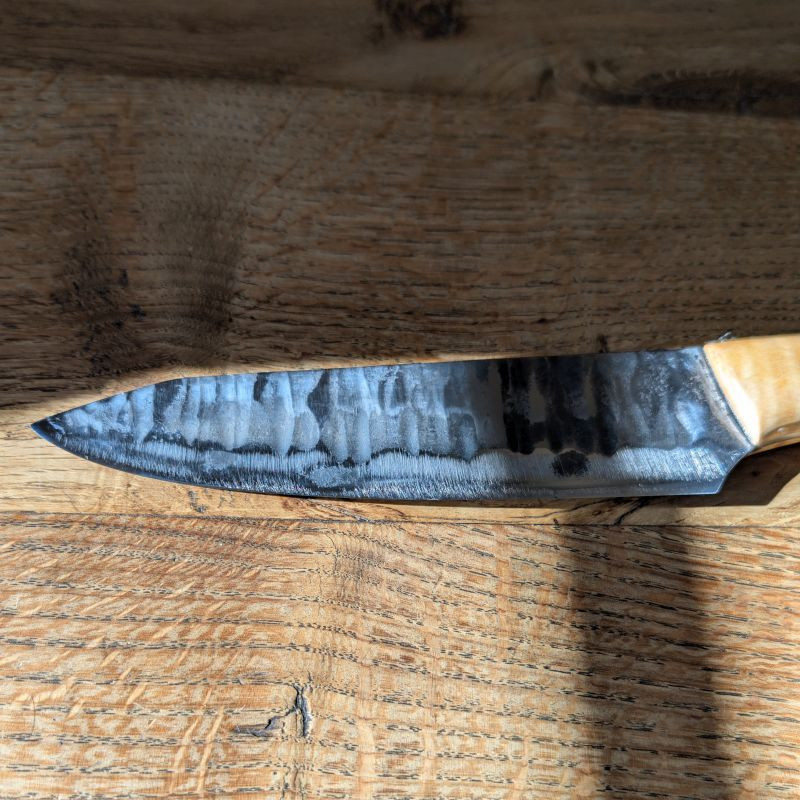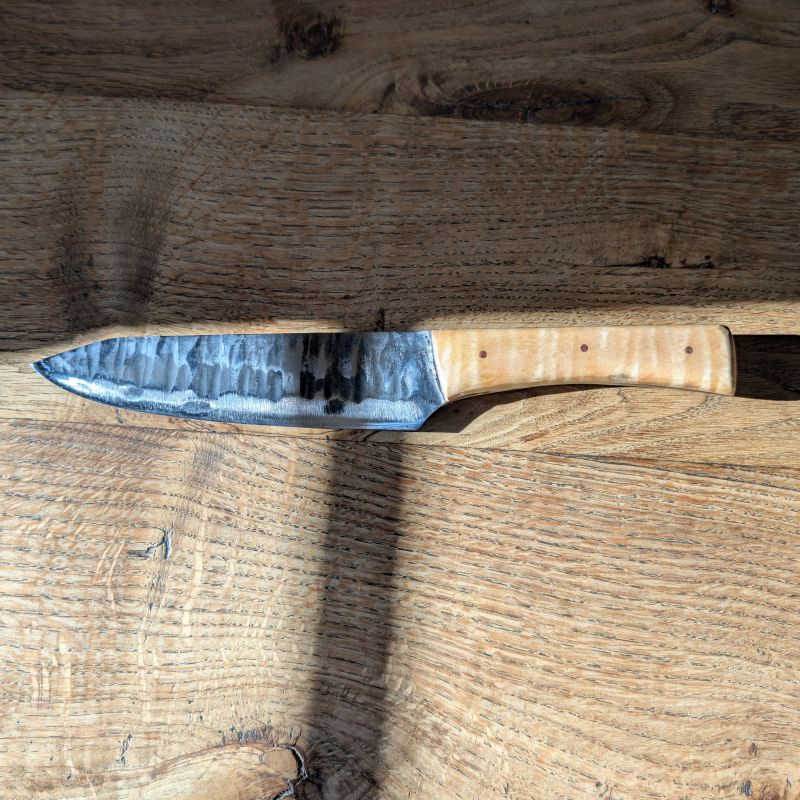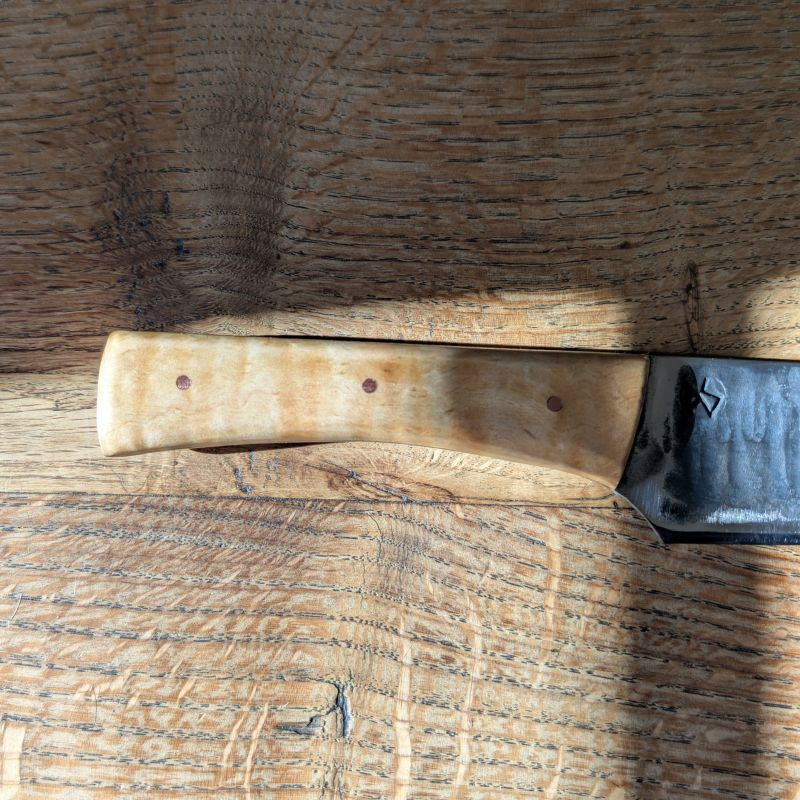 Handgeschmiedetes Küchenmesser aus Kohlenstoffstahl 1.2003.Griffschalen aus sehr wildem Riegelahorn mit Kupferstiften. Ein super Messer für alle Fälle in der Küche beim Grillen usw. Optional könnt ihr eine massive Lederscheide mit Befestigungsriegel aus Rinderleder dazu erwerben – einfach auswählen und Wunschfarbe (Schwarz, Brauntöne) beim Checkout als Nachricht hinterlassen.