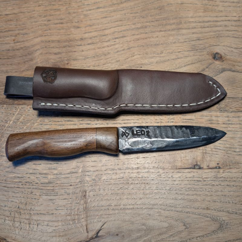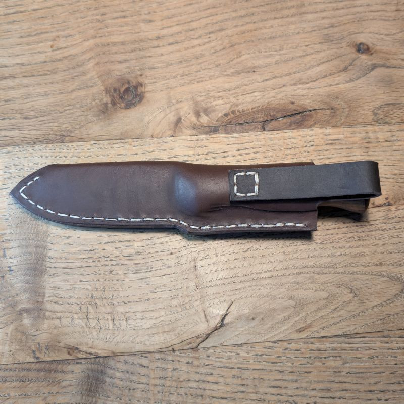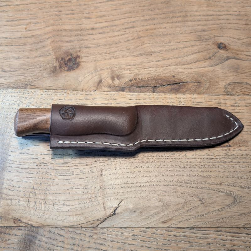 Outdoormesser mit einer Klinge aus dem Geschützrohr des Leopard 2 der BW. Der Griff ist aus Mooreiche und Nussbaum gefertigt. Dazu eine massive Lederscheide mit Gürtelschlaufe aus braunem Rindsleder.