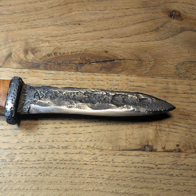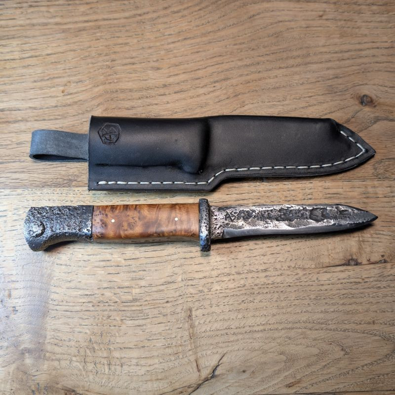 Outdoormesser aus einem deutschem Bodenfund-Bajonett K98 des 2WK.Das Messer hat eine sehr archaische Optik da es lange in der Erde lag. Die originalen Griffe usw waren alle vergammelt. Die Griffschalen sind aus marokkanischer Thujaknolle. Dazu eine massive Lederscheide mit Gürtelschlaufe aus schwarzem Rindsleder.Dieses Messer erzählt seine eigene Geschichte und stellt eine absolute Rarität da. In der Galerie seht ihr auch den Istzustand vor dem umschmieden! Ganz wichtig ist es hier zu erwähnen das dieses arschisch anmutende Bajonett trotz der rauhen Erscheinung voll einsatzfähig ist wie alle anderen Messer hier!