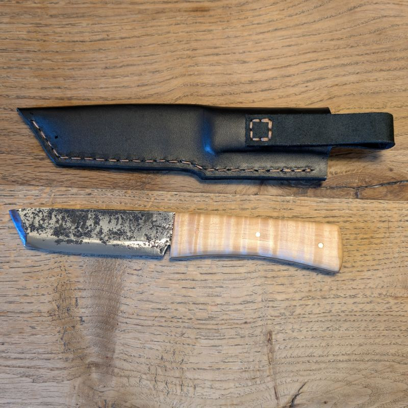 Allzweckmesser mit einer handgeschmiedeten Klinge aus der Bodenpanzerung der Heinkel 177 des 2WK.Griffschallen aus sehr markantem Riegelahorn. Dazu eine massive Lederscheide mit Gürtelschlaufe aus schwarzem Rindsleder.
