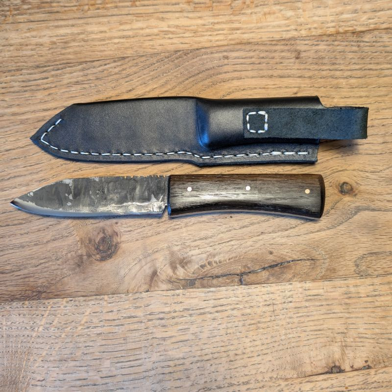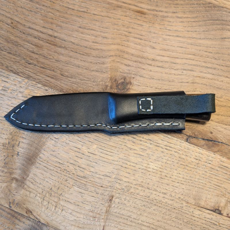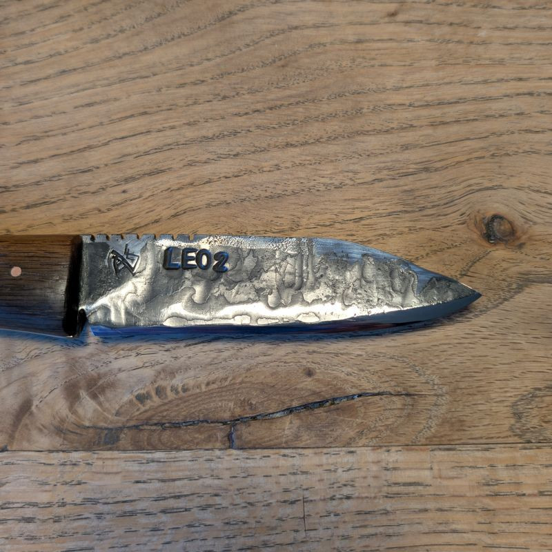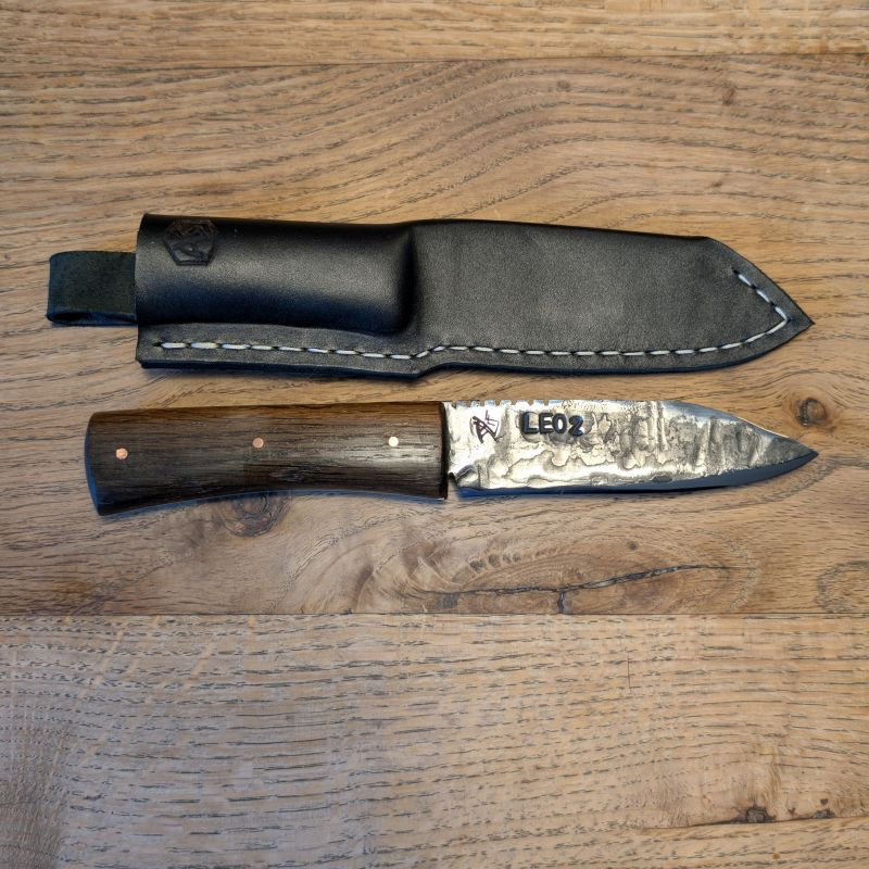 Allzweckmesser oder Jagdmesser mit einer Klinge aus dem Geschützrohr des Leopard 2 der BW. Zusätzlich am Rücken Rillen eingeschliffen für sicheren Daumen. Die Griffschalen sind aus ca. 5000 Jahre alter Mooreiche. Dazu eine massive Lederscheide mit Gürtelschlaufe aus schwarzem Rindsleder.