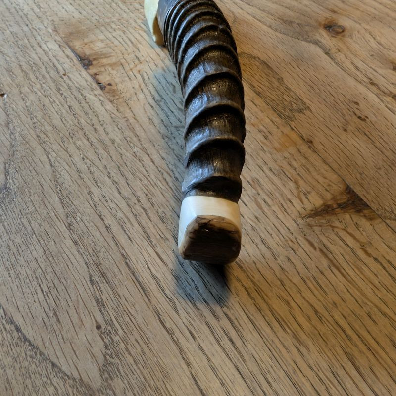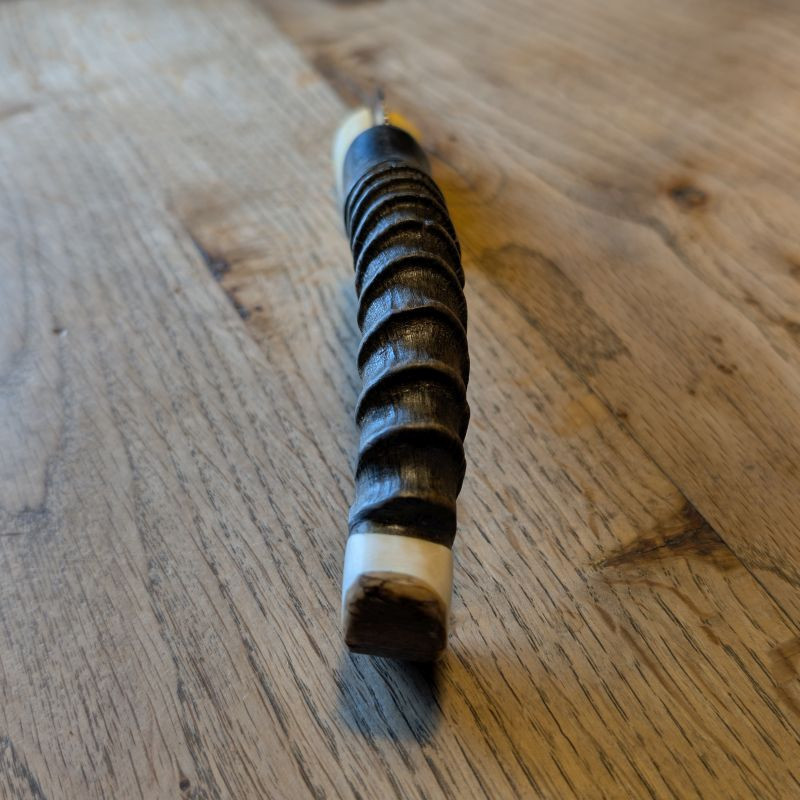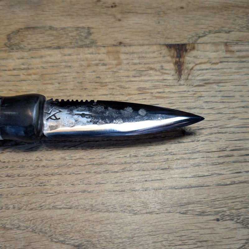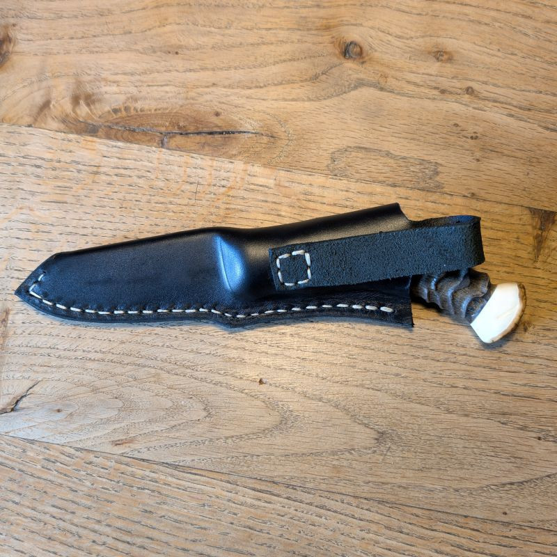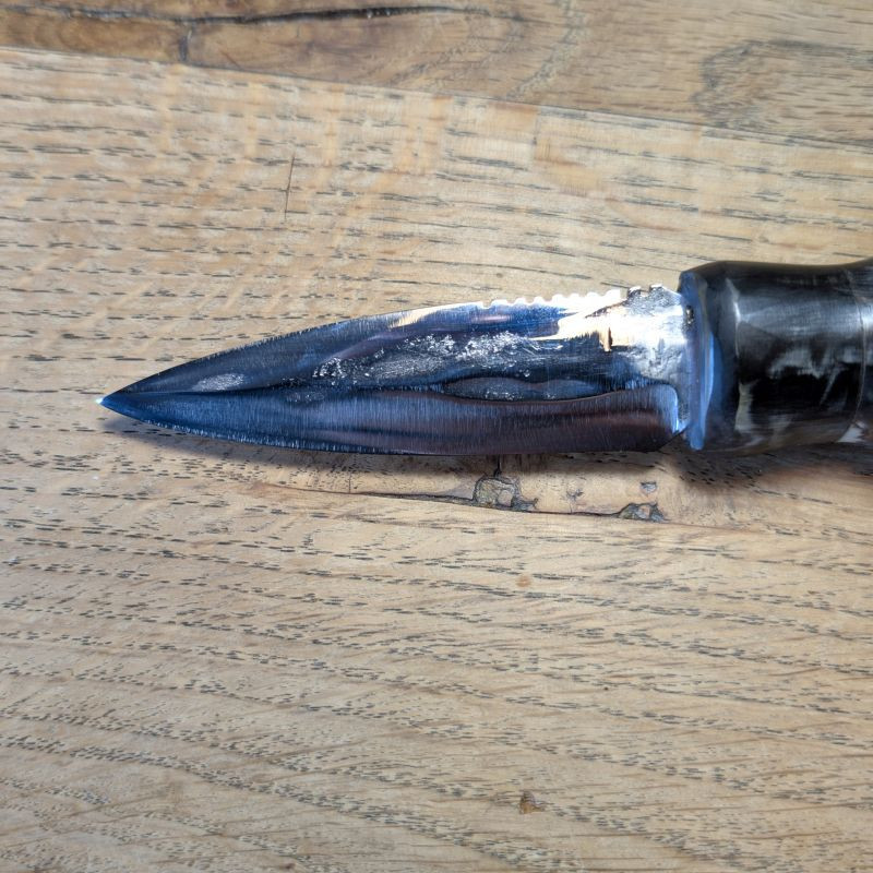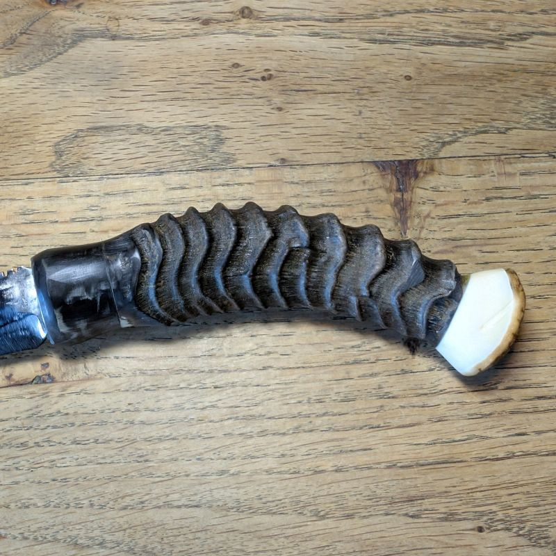 Jagd oder Allzweckmesser mit einer Klinge aus Wolframstahl 1.2519. Die Klinge ist Dolchartig aber nur einseitig geschliffen und mit einer Zahnung als Rutschschutz versehen. Der Griff ist aus Antilopenhorn vorne mit Büffelhorn und als Abschluss jakutisches Mammutelfenbein. Dazu eine massive Lederscheide mit Gürtelschlaufe aus schwarzem Rindsleder. Das ist ein Arbeitsmesser für Jäger oder Menschen die sich gerne draußen aufhalten. Ich verkaufe es ab 18 Jahren.