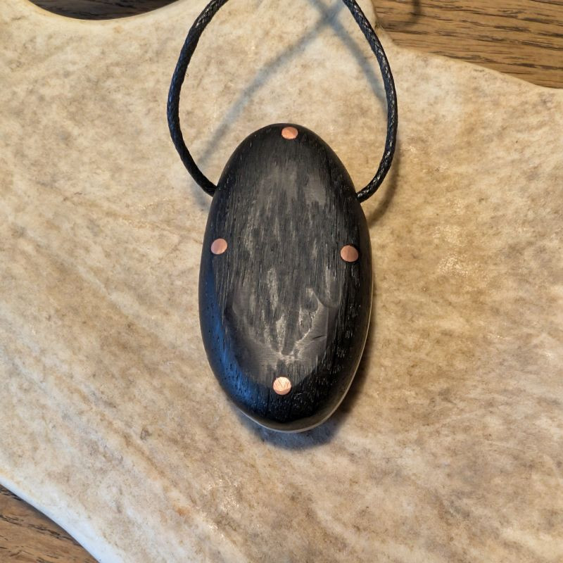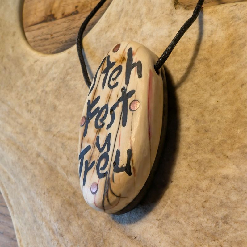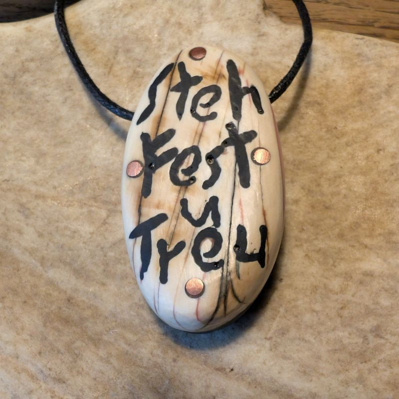 Kettenanhänger aus jakutischem Mammutelfenbein und Flusseiche mit Kupferstiften. Der Schriftzug ist eingeschnitzt und mit Kohle gefärbten Epoxidharz eingefärbt. Danach habe ich ihn noch stabilisiert unter Vakuum. Nicht im Schwimmbad, Sauna usw. tragen! Geliefert an einer gewachsten Baumwollkordel.