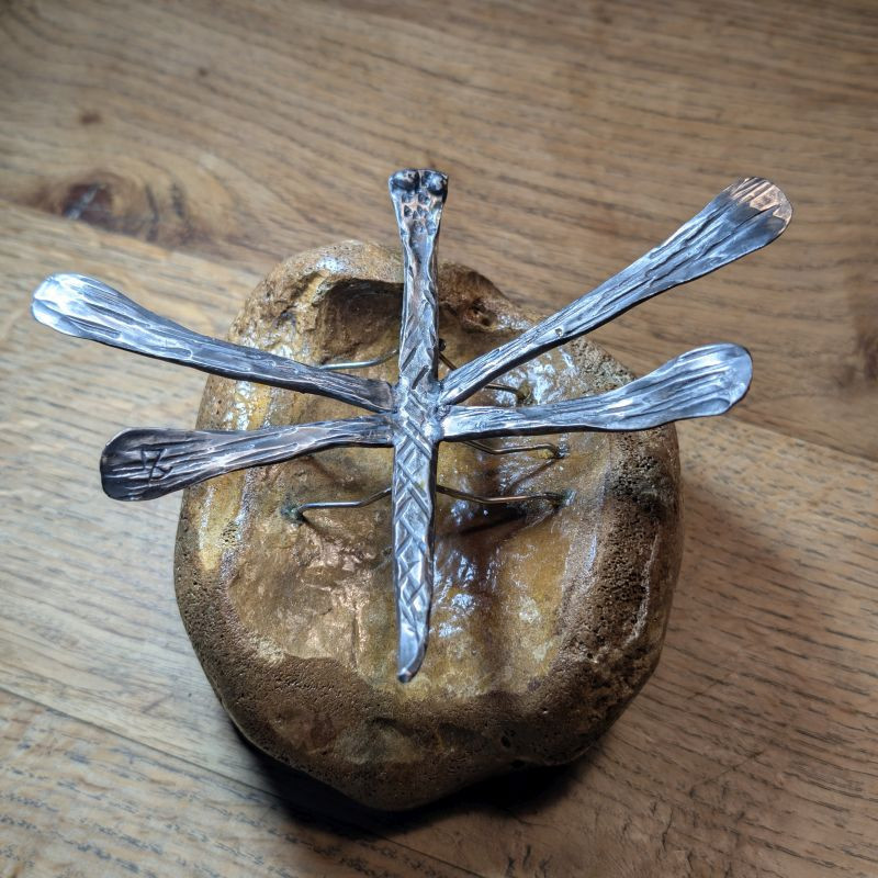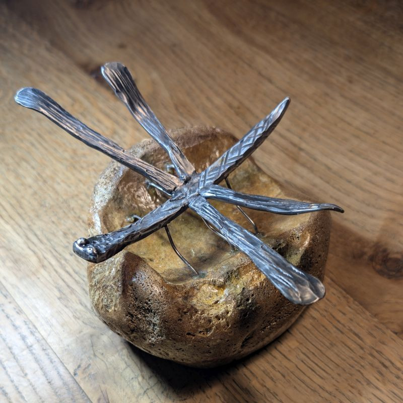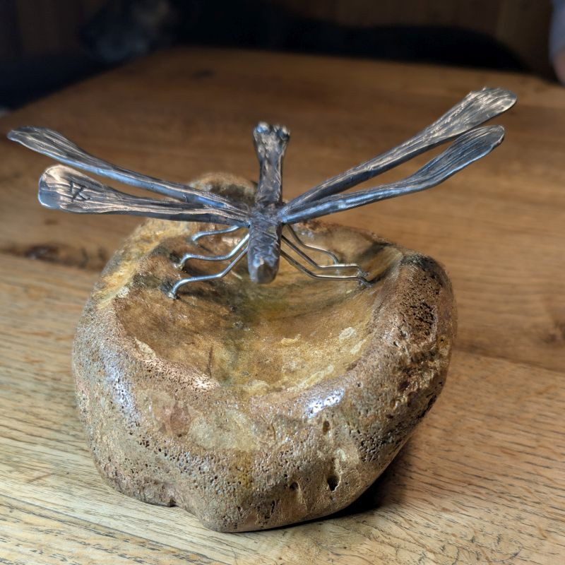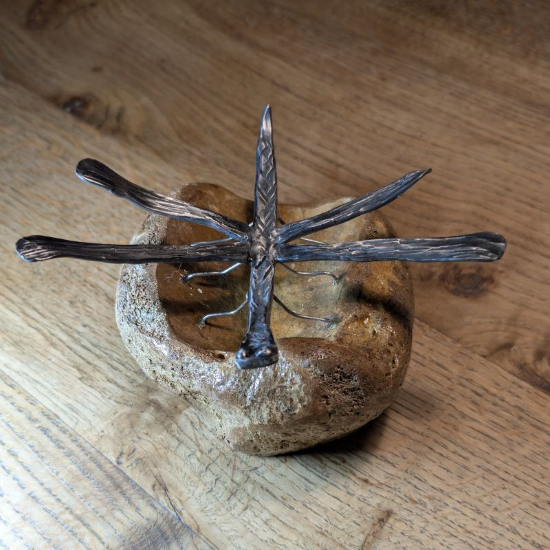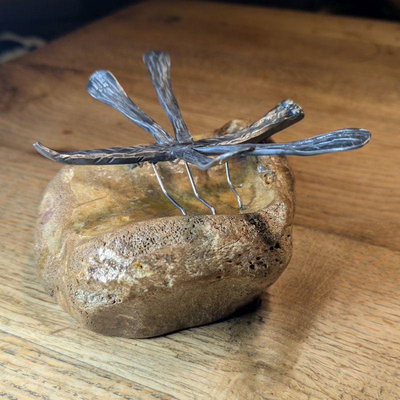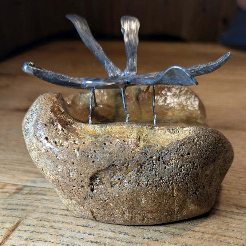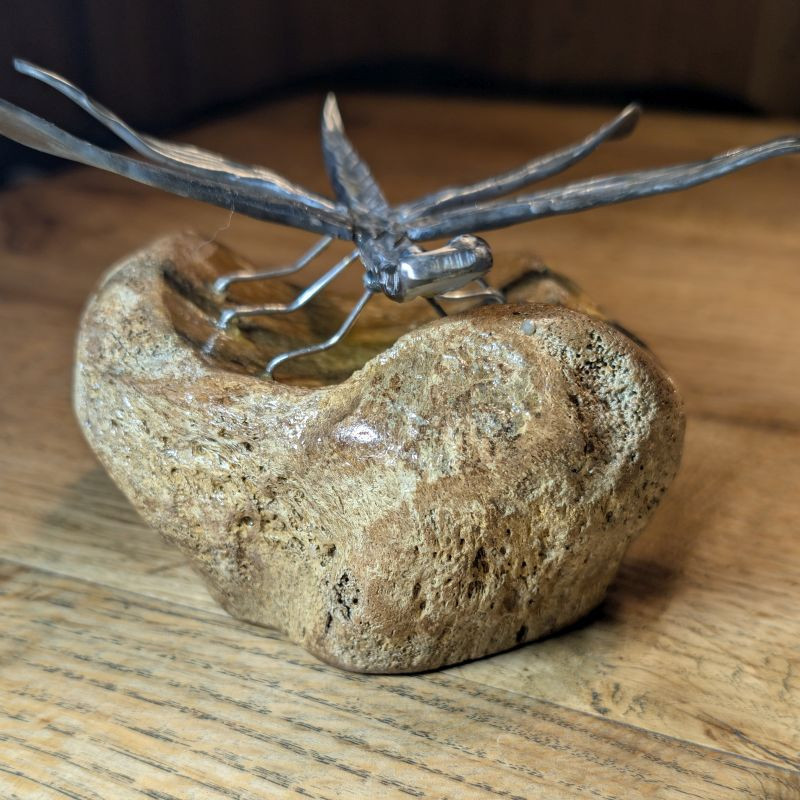 Ein absolutes Einzelstück das garantiert nur 1x existiert. Geschmiedete Libelle aus rostfreiem Edelstahl sitzend auf einem Tibiakopf eines Mammut aus der letzten Eiszeit. Der Knochen stammt aus Deutschland und er wurde von mir selber stabilisiert. Er stammt aus der letzten Eiszeit und ist ca. 10-30.000 Jahre alt. Ein tolles Unikat für das überall Platz ist. Da der Knochen stabilisiert ist könnte man es auch draußen hinstellen den die Libelle ist auch rostfrei!
