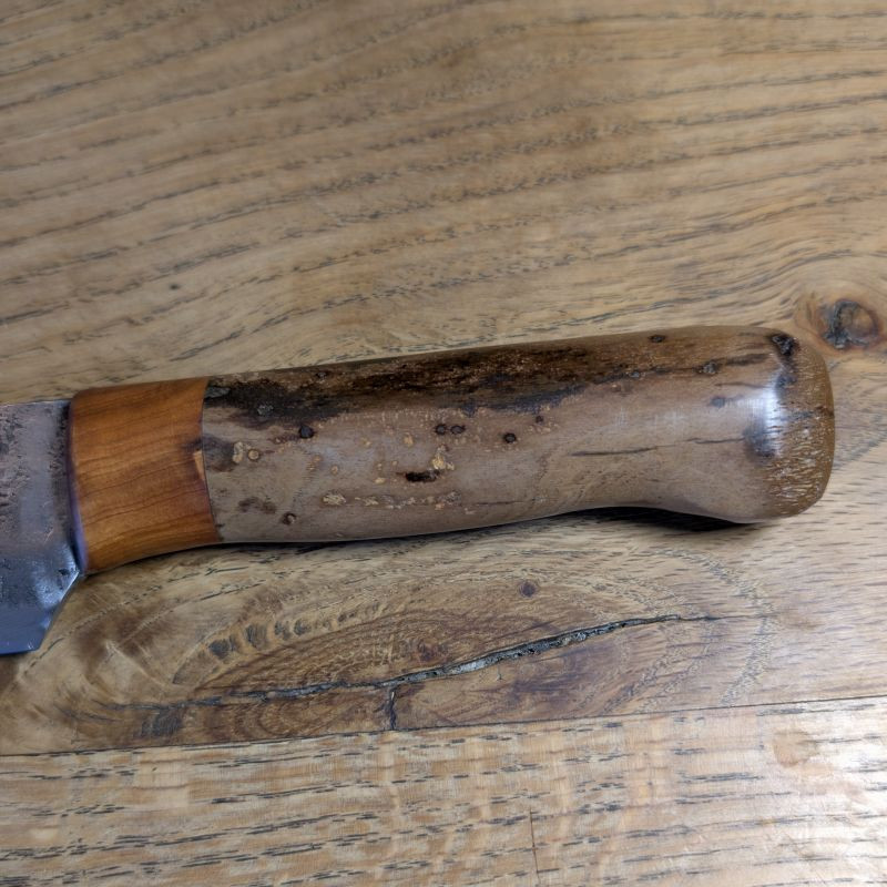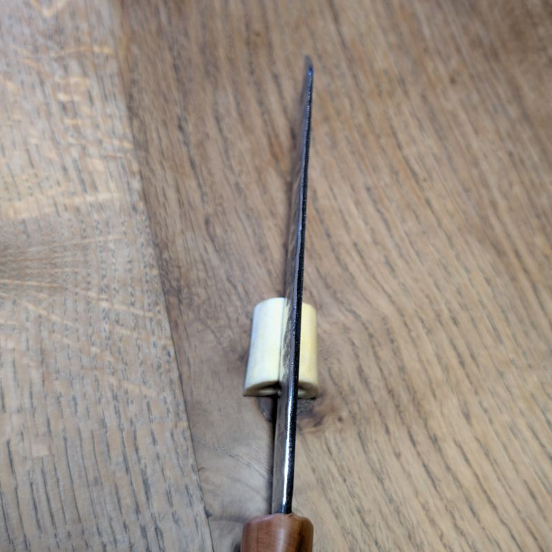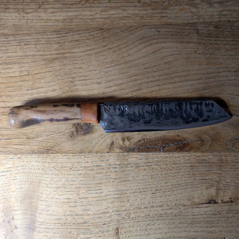 Küchenmesser mit einer von Hand geschmiedeten Klinge aus einem Kanonenrohr 3,7cm PAK des 2WK. Der Griff ist aus einem von von mir selber stabilisiertem Hirschgeweih mit marokkanischer Thujaknolle. Das Hirschgeweih ist ca. 10- 30-000 Jahre alt. Optional könnt ihr eine massive Lederscheide mit Befestigungsriegel aus Rinderleder dazu erwerben – einfach auswählen und Wunschfarbe (Schwarz, Brauntöne) beim Checkout als Nachricht hinterlassen.