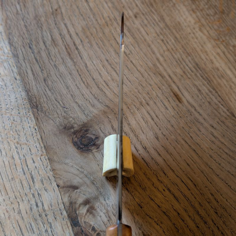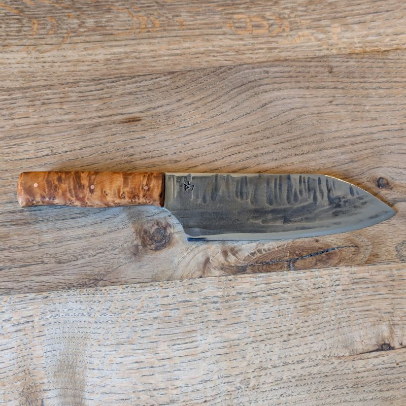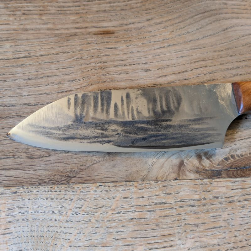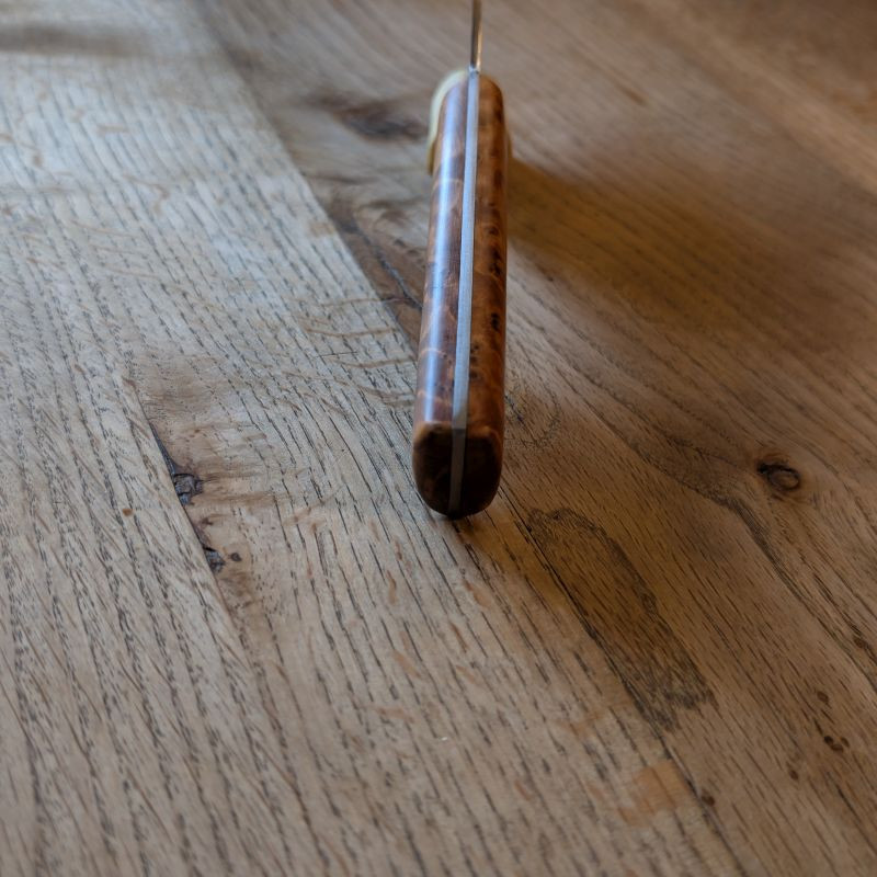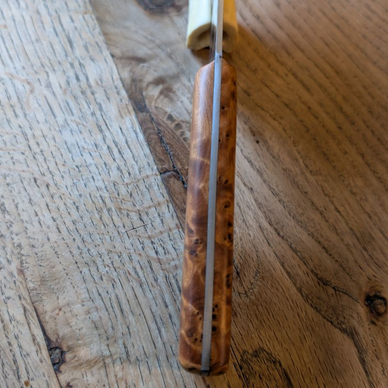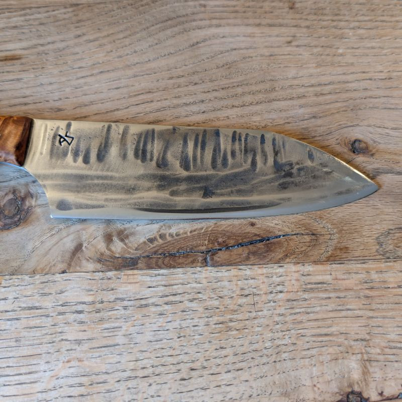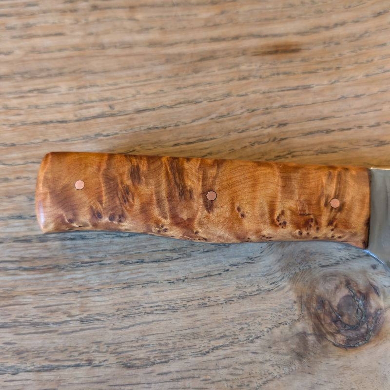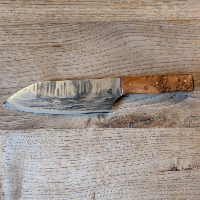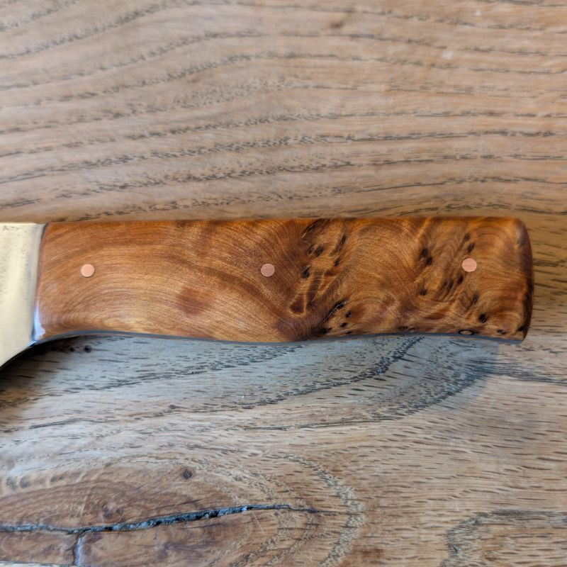 Küchenmesser mit eier Klingeaus äußerst schnittfestem Wolframstahl 1.2419. Die Klinge ist äußerst belastbar und für alles in der Küche usw geeignet. Der sehr besondere Griff ist aus marokkanischer Thujaknolle. Optional könnt ihr eine massive Lederscheide mit Befestigungsriegel aus Rinderleder dazu erwerben – einfach auswählen und Wunschfarbe (Schwarz, Brauntöne) beim Checkout als Nachricht hinterlassen.